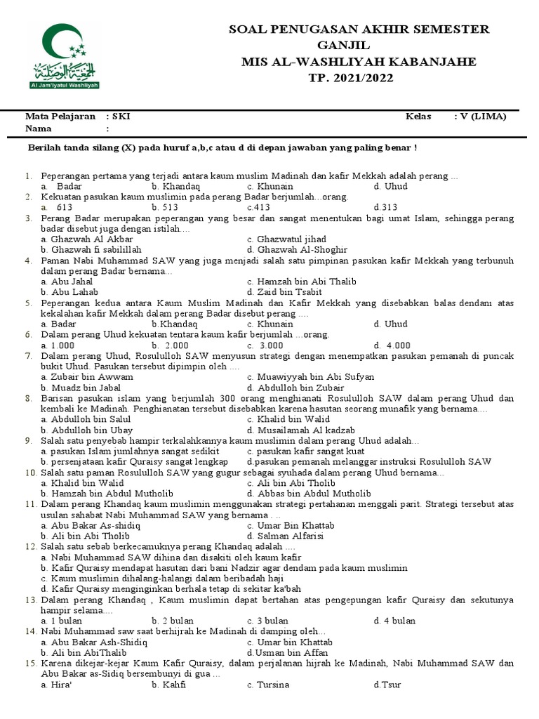 Ujian Akhir Semester (PAS/UAS) merupakan bagian integral dari proses evaluasi pembelajaran. Bagi siswa Kelas 1 MI, mata pelajaran Sejarah Kebudayaan Islam (SKI) bertujuan untuk menanamkan kecintaan dan pemahaman dasar tentang ajaran Islam melalui kisah-kisah teladan. Contoh soal yang disajikan di atas diharapkan dapat menjadi panduan bagi guru dan orang tua dalam mempersiapkan siswa menghadapi PAS/UAS Semester 1. Dengan latihan yang terarah dan metode pembelajaran yang menyenangkan, siswa dapat mencapai hasil yang optimal sekaligus memperkuat pondasi keislaman mereka. Ingatlah, tujuan utama bukan hanya nilai, melainkan penanaman karakter dan rasa cinta terhadap sejarah agung para nabi dan rasul.