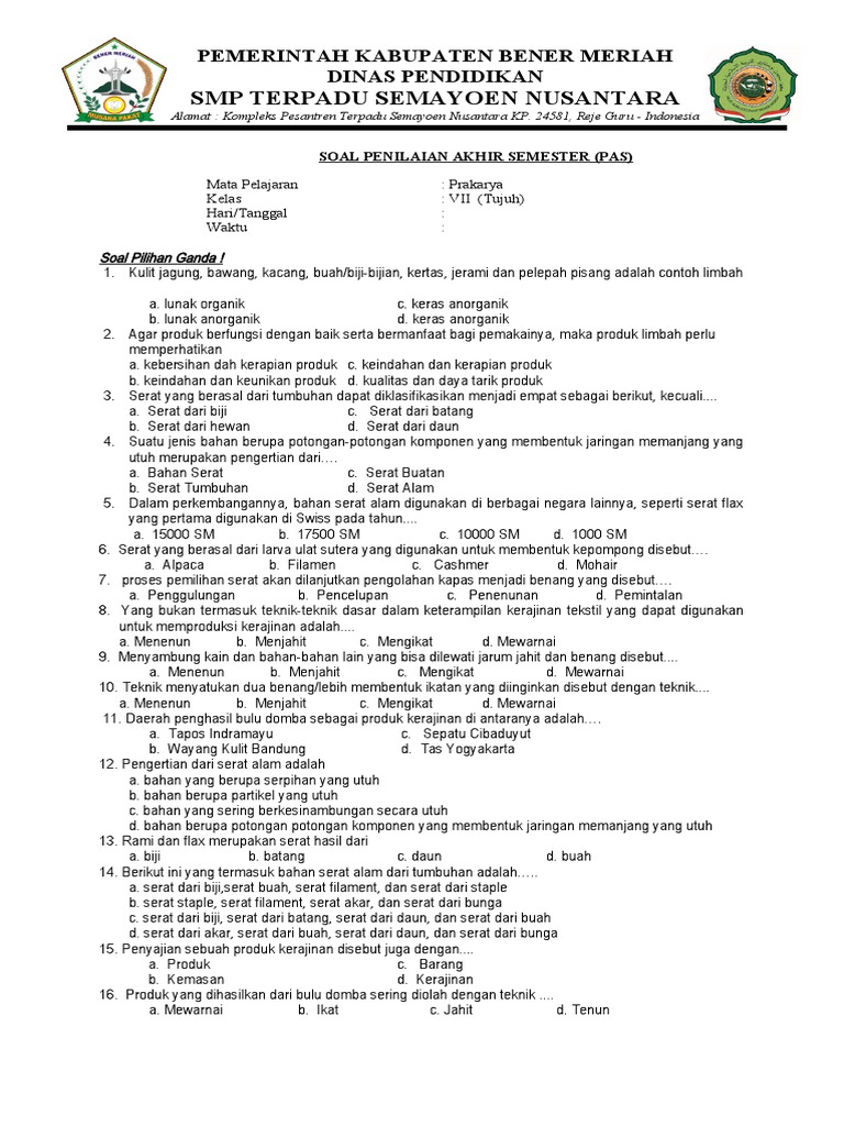 Setiap soal akan dilengkapi dengan penjelasan singkat mengenai konsep yang diuji, sehingga siswa tidak hanya berlatih menjawab, tetapi juga memperdalam pemahaman mereka. Dengan total sekitar 1.200 kata, artikel ini diharapkan dapat menjadi panduan belajar yang komprehensif bagi para siswa kelas 7 dalam mempersiapkan diri menghadapi PTS Prakarya.