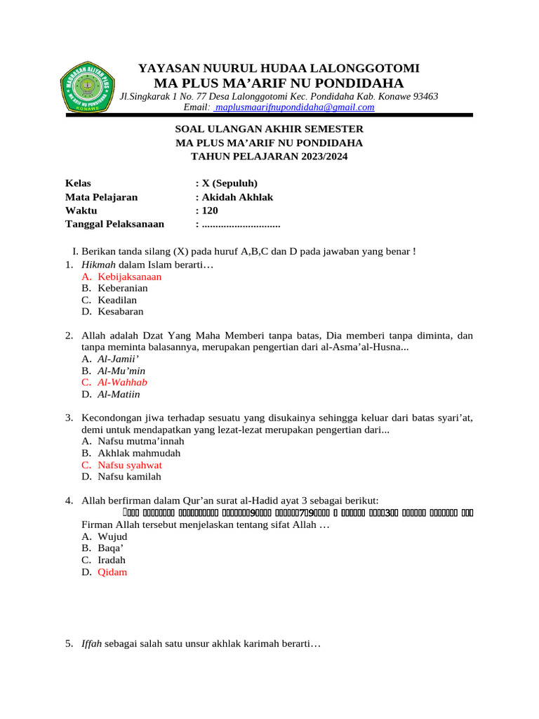Berikut adalah beberapa contoh soal UAS Akidah Akhlak kelas 6 semester 2 beserta pembahasannya: